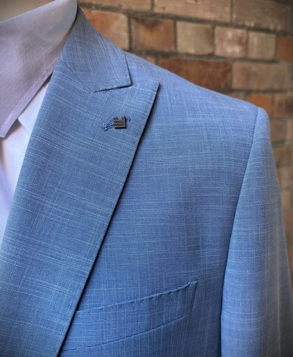 This sky blue suit made by Torre is the perfect lightweight summer suit, constructed of 46%Polyester, 44%Viscose, 7%Nylon and 3%Elastane.