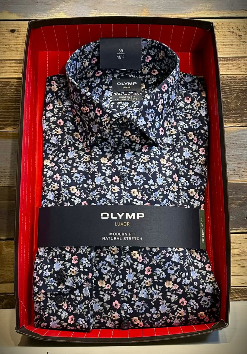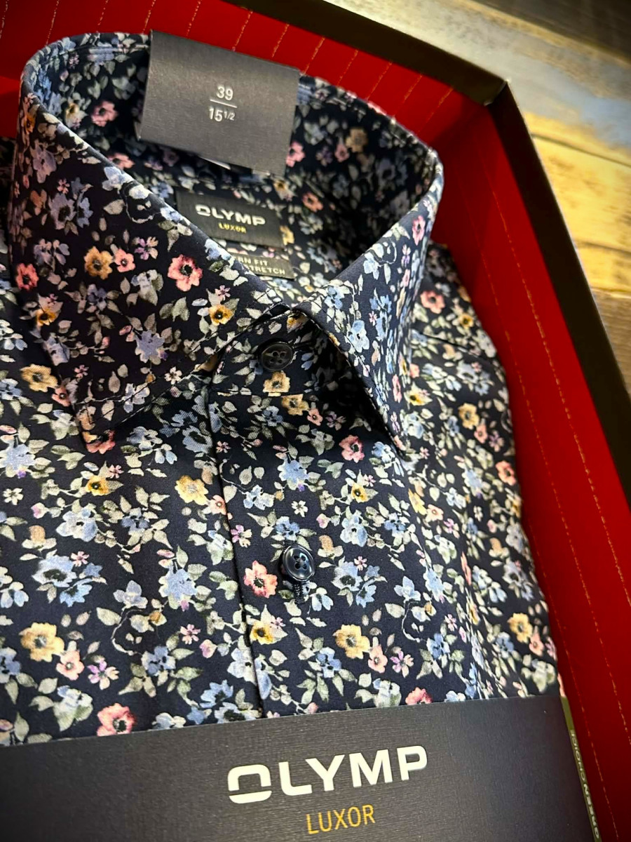Pure cotton navy floral shirt made by Olymp in a tailored fit.