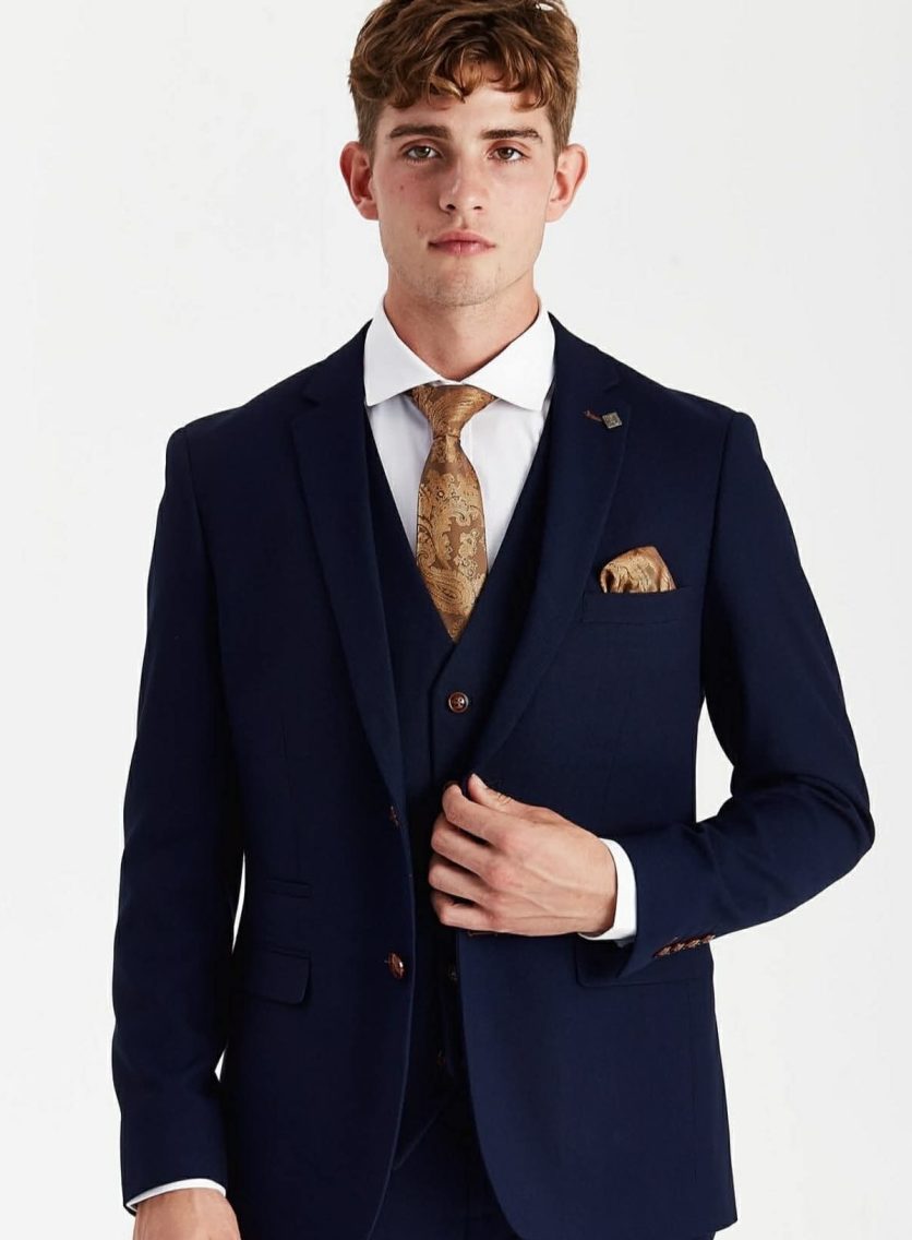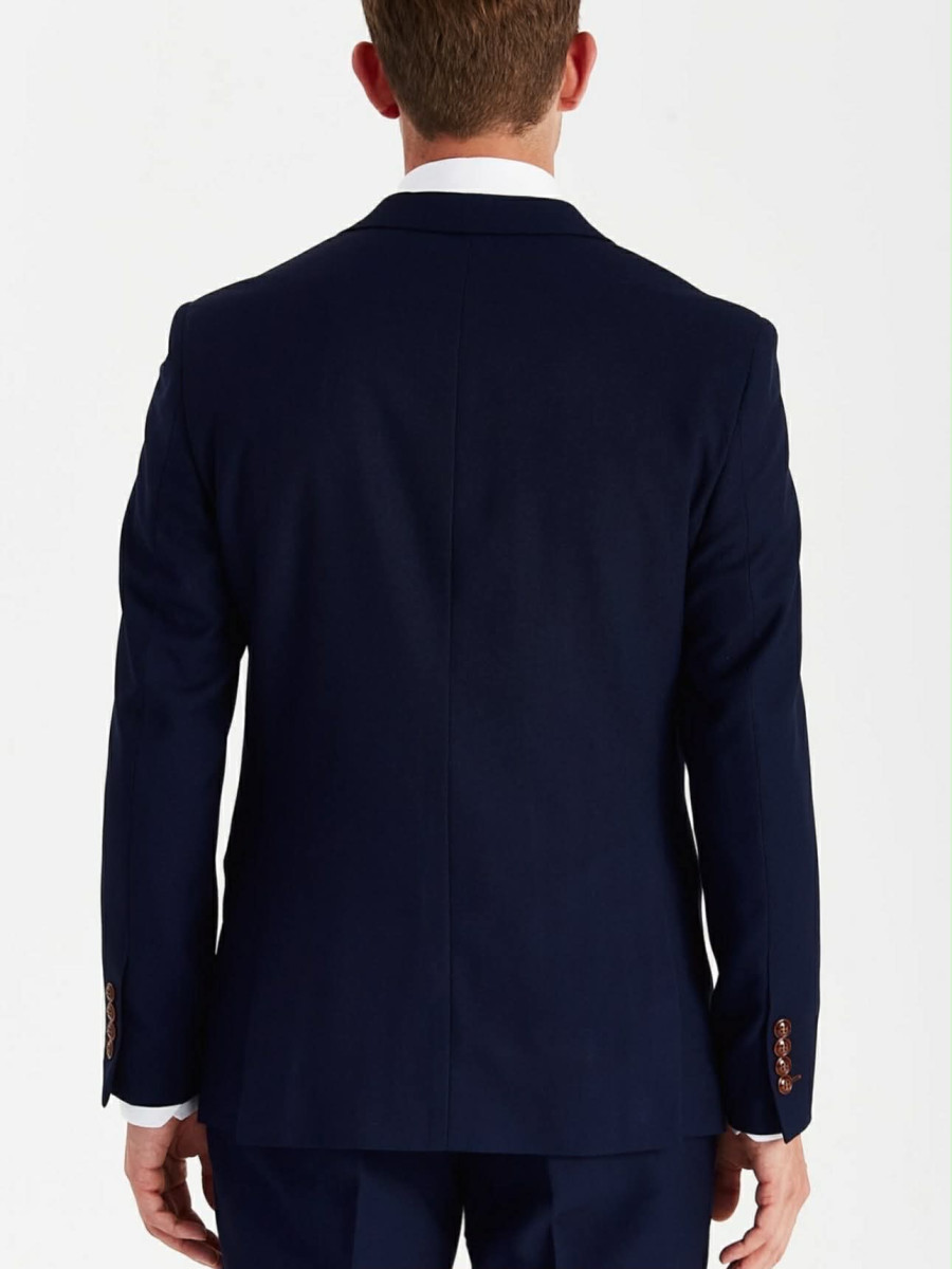 This three-piece suit by Paul Andrew is finished in a textured deep navy with contrasting brown buttons. Constructed of 75% Polyester, % Viscose and % Spandex.